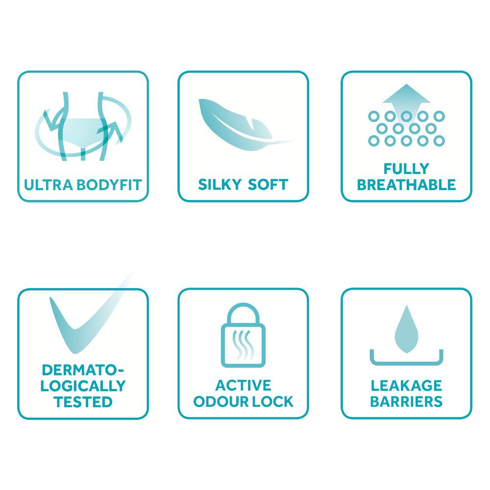 Der stark saugfähige Kern mit Superabsorber sperrt Feuchtigkeit und Gerüche schnell ein und hält Sie den ganzen Tag lang trocken und bequem. Zusätzlich bieten die innenliegenden Auslaufbarrieren extra Schutz vor unerwünschten Lecks und ermöglichen Ihnen, Ihre täglichen Aktivitäten ohne Sorgen zu genießen.