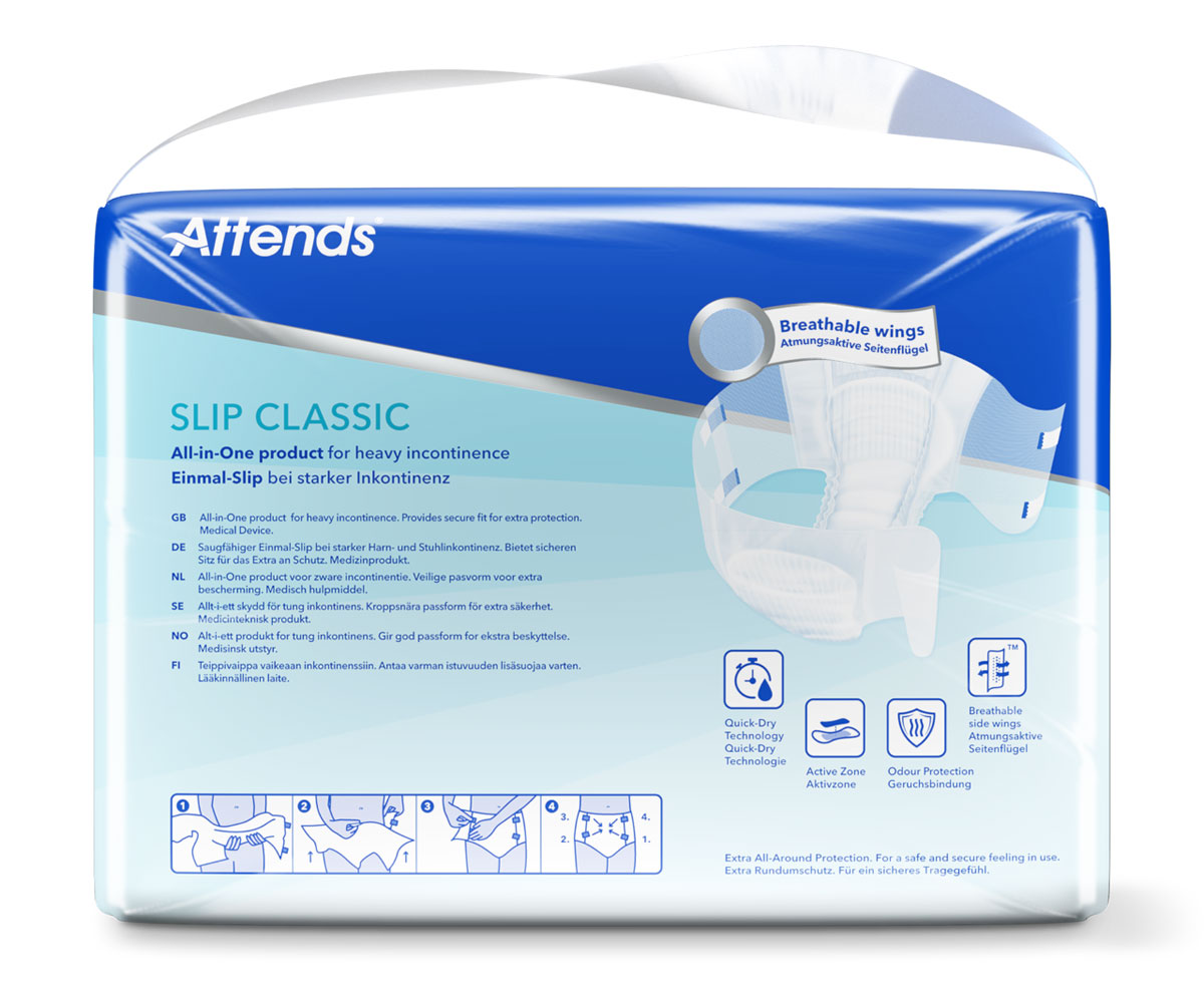 Der Attends Slip Classic 10M lässt sich mit 4 Klebeverschlüssen bequem anlegen. Die Slips Classic sind erhältlich in den drei Saugstärken 8, 9 und 10 in den Konfektionsgrößen Extra Small bis Large und sind geeignet bei starkem Urin- und Stuhlverlust.