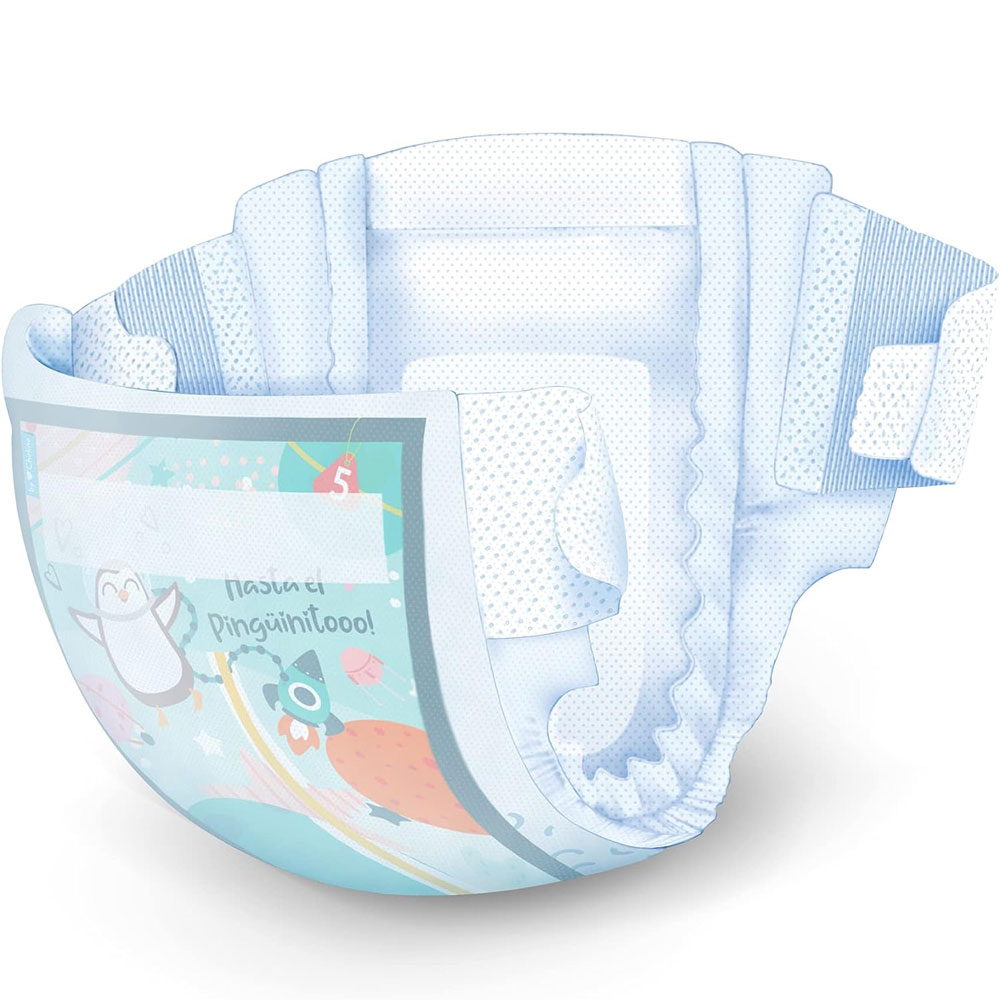 Dank des weichen, hypoallergenen Vliesstoffbezugs sind die Windeln besonders sanft zur empfindlichen Haut und minimieren das Risiko von Irritationen. Ein doppelt verstärkter Absorptionskern aus Zellulosepaste und Superabsorber garantiert maximale Saugkraft, während eine spezielle Aufnahme- und Diffusionsfolie die Flüssigkeit schnell aufnimmt und gleichmäßig verteilt – für langanhaltende Trockenheit.