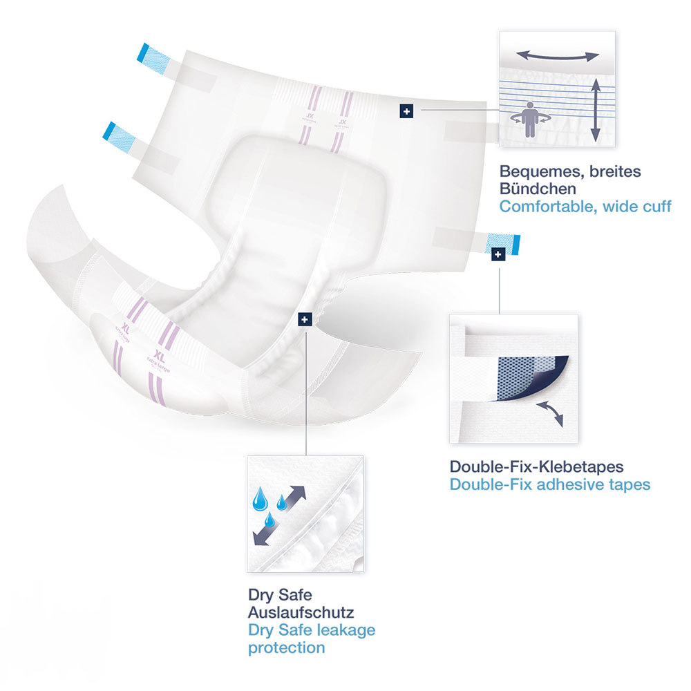 Der mehrlagigen Saugkörper mit Verteilerkanälen sorgen für eine gleichmäßige Verteilung der Flüssigkeit im gesamten Saugkern. Flüssigkeit wird schnell von der Haut wegtransportiert, was Irritationen vorbeugt und die Haut angenehm trocken hält. Die atmungsaktive Außenschicht unterstützt die Luftzirkulation, leitet Feuchtigkeit nach außen und sorgt für optimalen Hautschutz.
