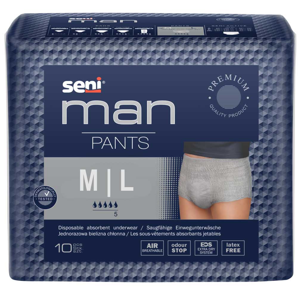 Relativ neu sind die attraktiv gestalteten Pants oder Einweghosen für Herren. Diese sind komplette Slips mit einer eingearbeiteten Saugeinlage. Die Pants bieten eine optimale Bewegungsfreiheit und einen hohen Tragekomfort. Optisch sind diese einen herkömmlichen Slip angelehnt. Der Marktführer in Herrenpants ist Tena mit den Active Fit Pants und Tena Men Level 4. Diese eignen Sich für leichte bis mittlere Blasenschwäche. Anders als bei den Unisex Pants, ist bei den Pants für Männer der Saugkörper mehr im vorderen Bereich angelegt. Dies ist anatomisch gesehen viel elektiver. Nun hat auch Seni ein passendes Produkt im Sortiment, die Seni Man Pants.