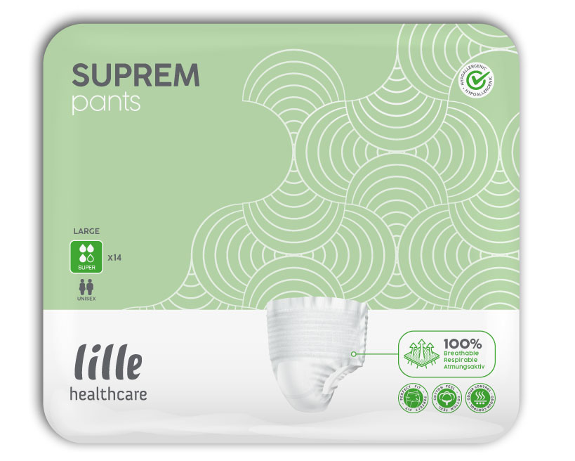 Die Suprem LILPANTS sind eine ideale Lösung zur Versorgung der mittleren Inkontinenz bei aktiven und mobilen Menschen. Mit ihren anwenderfreundlichen Eigenschaften von Inkontinenzslips stellen sie eine revolutionäre Innovation dar. Diese Pants können wie normale Unterwäsche angezogen und ausgezogen werden, und ein sicheres Ausziehen wird durch einfaches Auseinanderreißen der Slipnähte erreicht.