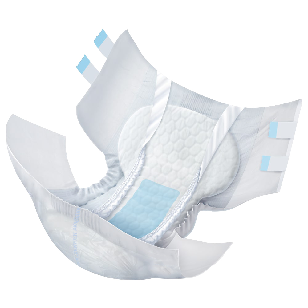 Die Megamax Windeln für Erwachsene verfügen über eine atmungsaktive, textilähnliche Außenfolie und sind mit je zwei Klebeverschlüssen pro Seite versehen. Dank einer verstärkten Zone im vorderen Bereich ist ein Einreißen der Folie unter Belastung nahezu ausgeschlossen.