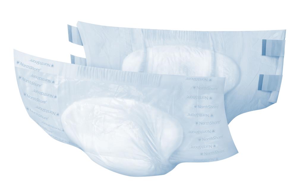 Die NorthShore Megamax Windeln besitzt eine Außenfolie, welche nicht atmungsaktiv ist. Für viele Menschen stellt dies noch einen psychischen Gewinn an Sicherheit dar. Geschlossen wird die Windel mit jeweils 2 großen Klebeverschlüssen pro Seite. Diese werden im vorderen Teil auf eine extra verstärkte Zone geklebt. Dies verhindert ein Einreißen der Folie auf Grund des höheren Gewichtes und der somit höheren Belastung im nassen Zustand der Megamax Windel. Die Außenfolie ist bei dieser Version im neutralen Weiß gehalten. Sie ist besonders strapazierfähig und verhindert effizient den Austritt von Gerüchen.