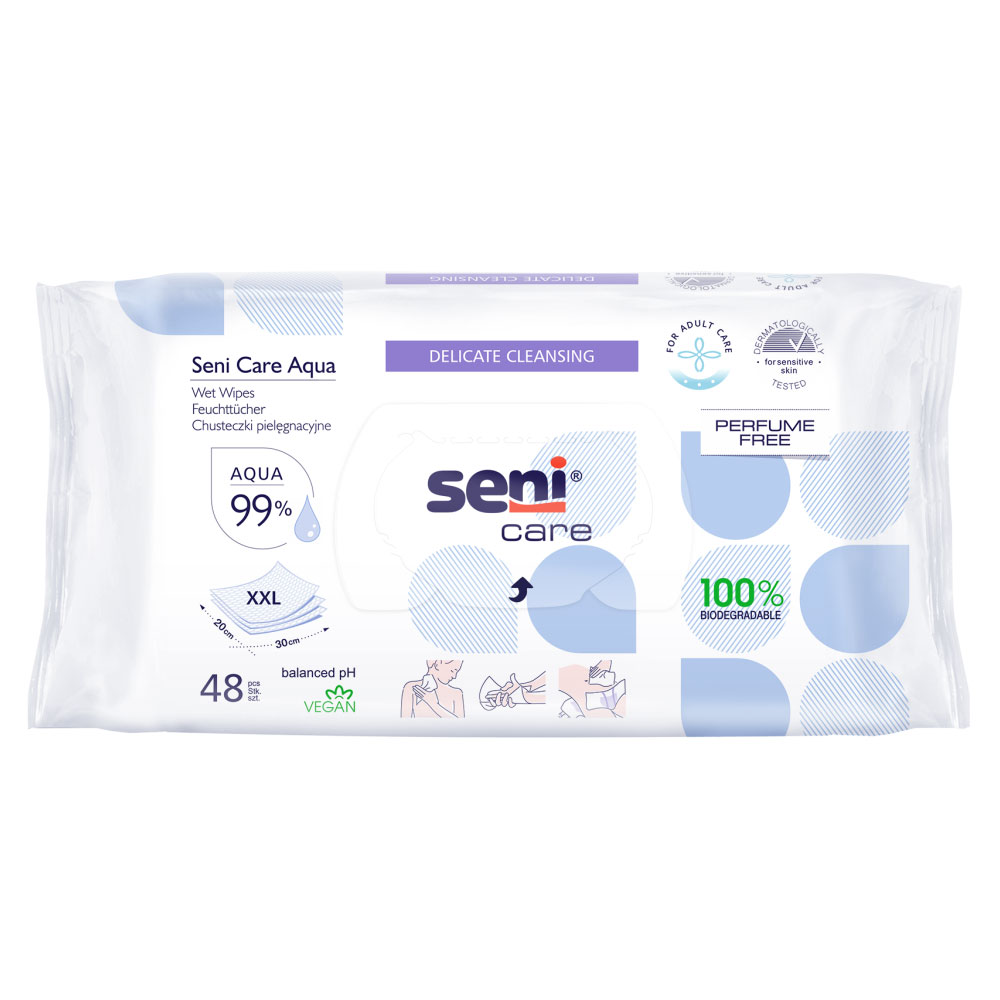 - Die Seni Care Aqua Feuchttücher sind dermatologisch getestet und für sensible Haut geeignet. Sie bieten eine einfache und hygienische Reinigung ohne Wasser und sind vegan. Perfekt für die Pflege zu Hause, im Krankenhaus oder auf Reisen.