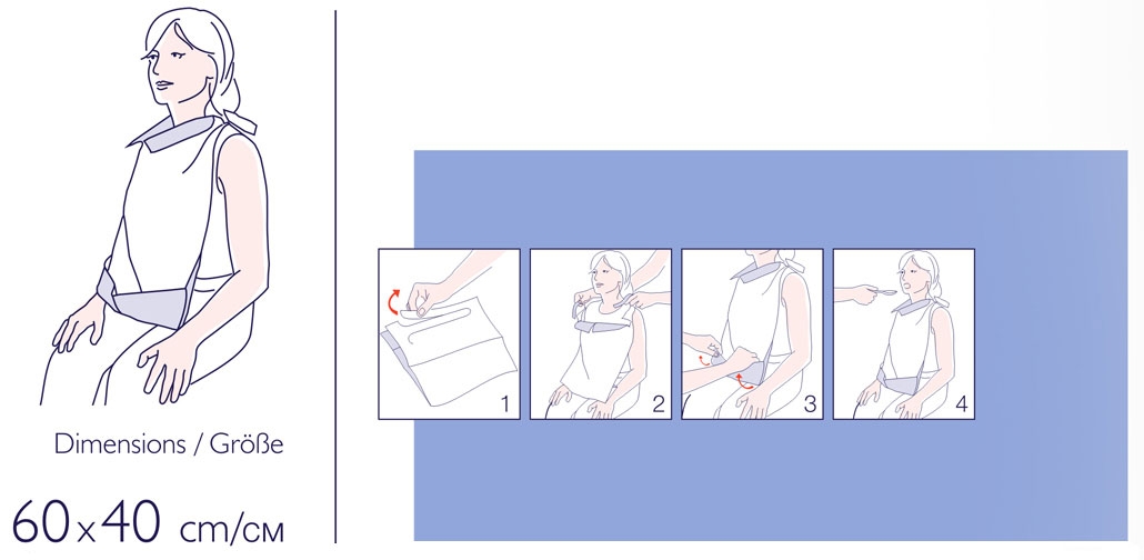 - die Einschnitte an der Schutzserviette bilden Bindelaschen zur Fixierung um den Hals sowie einen Schutzkragen