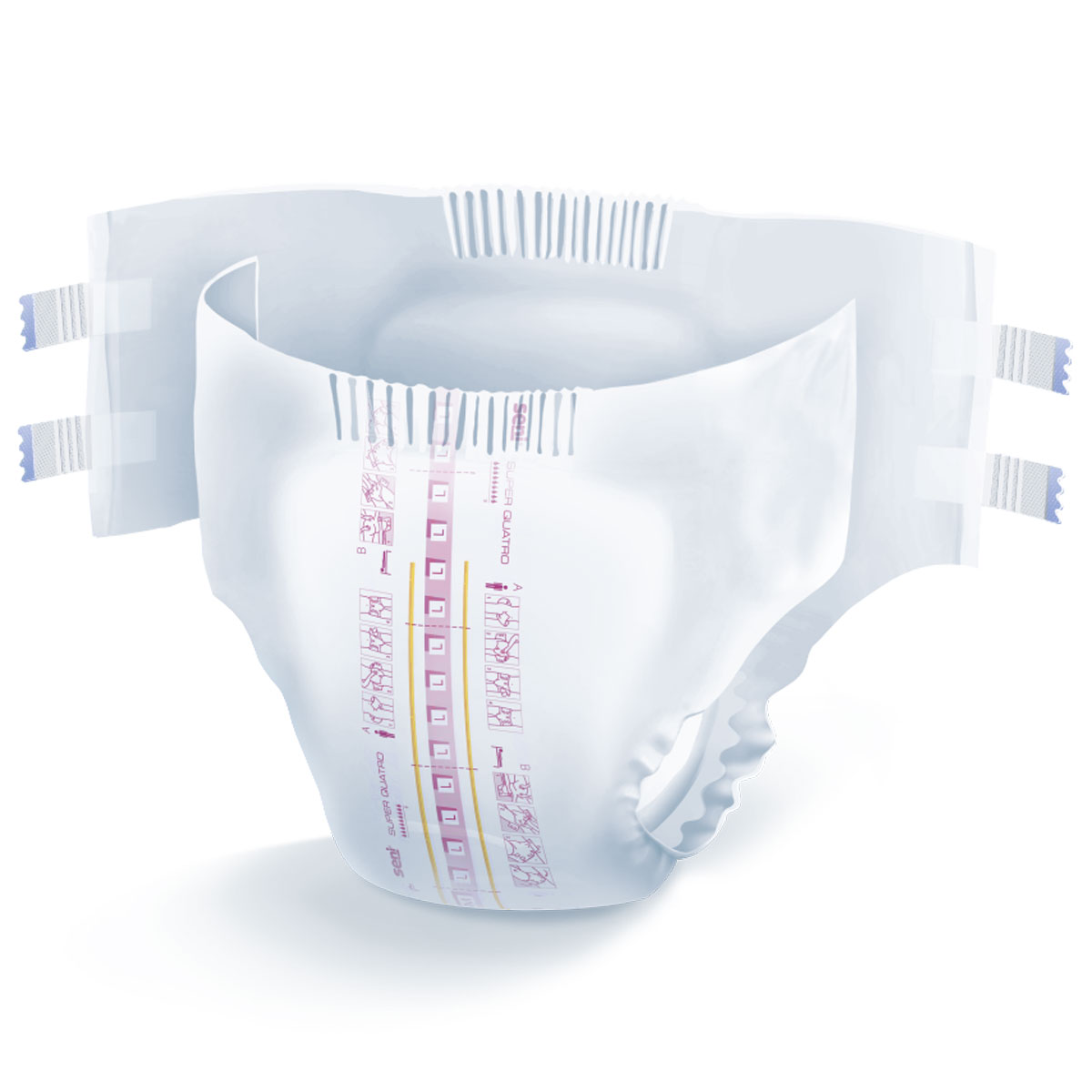 SENI Super QUATRO Windeln sind speziell für besonders schwere Inkontinenz mit hoher Saugstärke. Erkennbar sind sie an den purpur farbenden Streifen auf der Windel. Sie stellen somit die höchste Saugstärke im Seni Super Produktbereich dar.