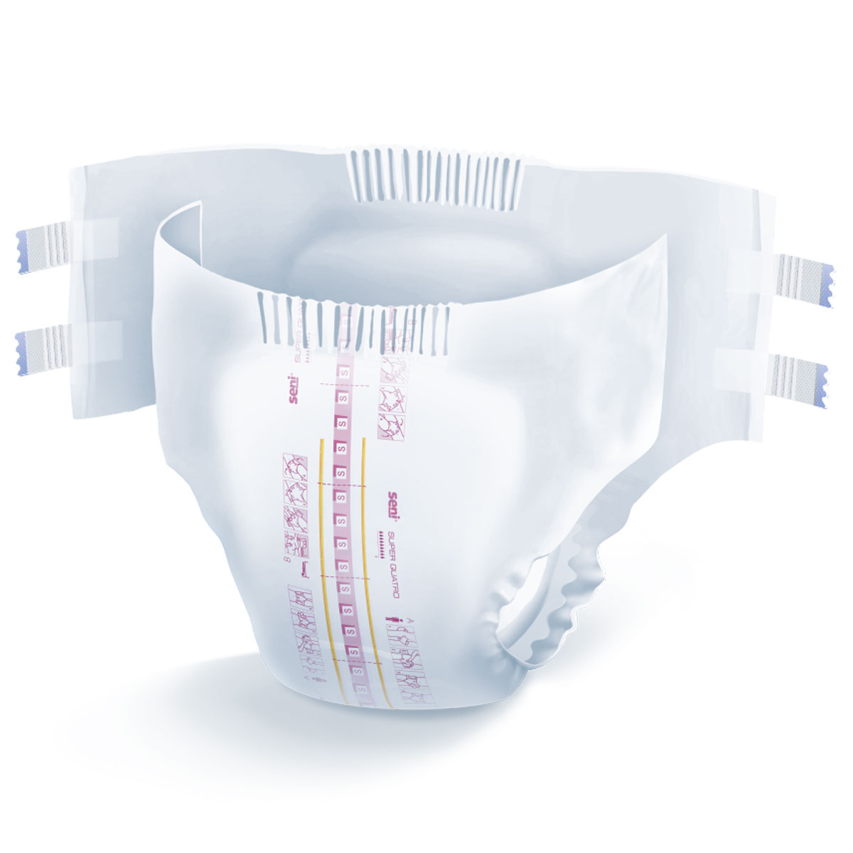 SENI Super QUATRO Windeln sind speziell für besonders schwere Inkontinenz mit hoher Saugstärke. Erkennbar sind sie an den purpur farbenden Streifen auf der Windel. Sie stellen somit die höchste Saugstärke im Seni Super Produktbereich dar.