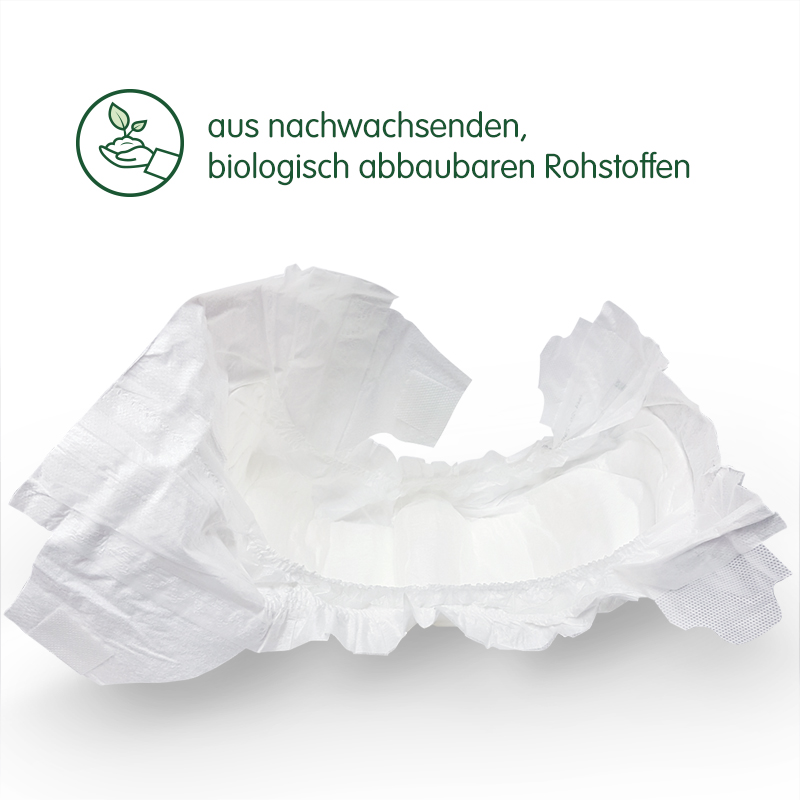 Absorptionskissen: FSC zertifizierte Zellulose (total chlorfrei gebleicht); Superabsorber: Polyacrylat; Aussenmaterial: atmungsaktives Laminat PLA Film (Maisstärke) mit Viskose Vlies (FSC); Verteilerlage: Polyester/Polypropylen ;Innenvlies: PLA / Green PE (Maisstärke/Zuckerrohr)Vlies; Auslaufschutz und Beinabschluss: Polypropylen-Vlies und Polyurethan Elastfäden; Klettband: Polypropylen; Klettverschluss: PE Film /Polypropylen Vlies; Frontohren: Polypropylen/Polyethylene; Klebstoffe; Beutel: Green PE (>85% aus nachwachsenden Rohstoffen);