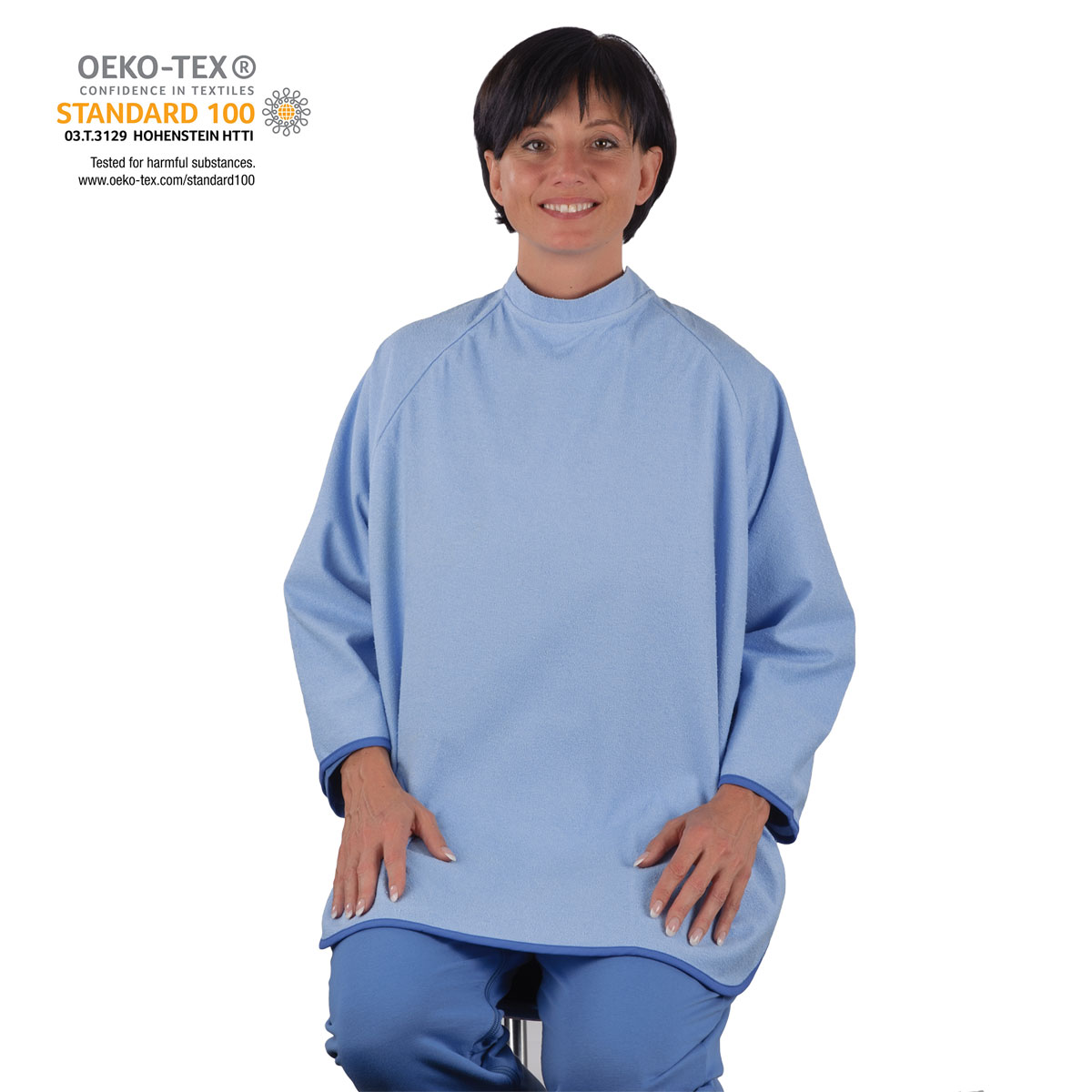Die Suprima Ess-Schürze mit Ärmeln und Schlaufenverschluss ist der ideale Begleiter für Menschen mit körperlichen Einschränkungen oder Schwierigkeiten beim Essen und Trinken. Die Ess-Schürze besteht aus weichem Frottee und ist in einem angenehmen hellblauen Farbton erhältlich. Die Schürze ist mit langen Ärmeln ausgestattet, die Kleidung umfassend vor Schmutz und Feuchtigkeit schützen. Durch die feuchtigkeitsundurchlässige Polyurethan-Beschichtung und die leicht saugende Oberfläche können Lebensmittelreste sofort von der Schürze aufgenommen werden. Die Schlaufen am Nacken sorgen dafür, dass die Schürze sicher sitzt und ein Verrutschen verhindert wird. Die Ess-Schürze ist leicht zu reinigen und kann bei hohen Temperaturen gewaschen werden. Mit der Suprima Ess-Schürze bleiben Kleidung und Bett bei jeder Mahlzeit sauber und hygienisch.