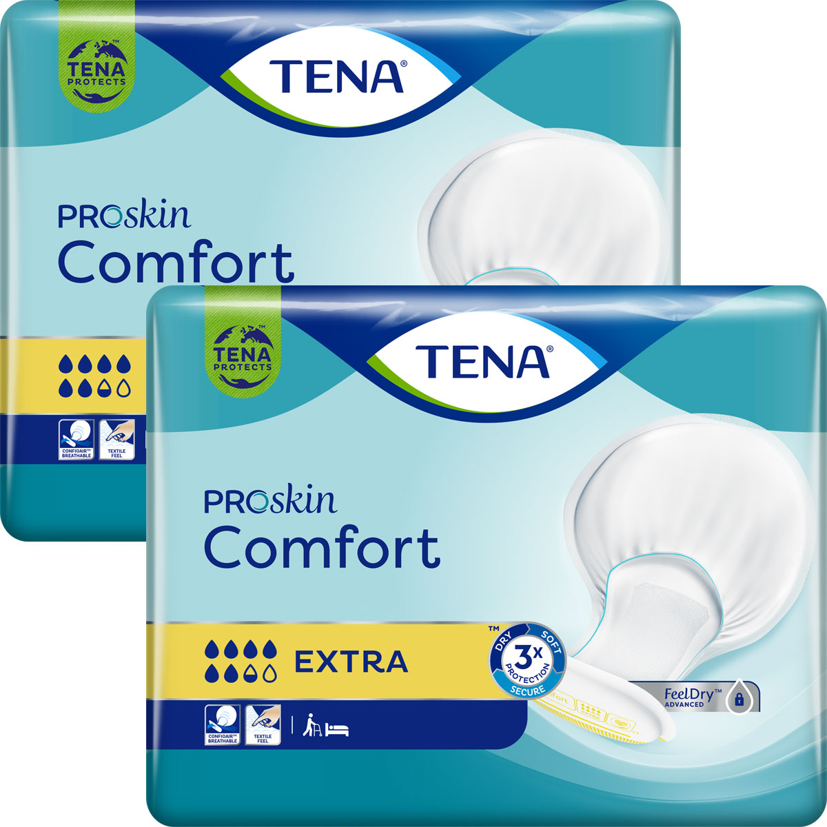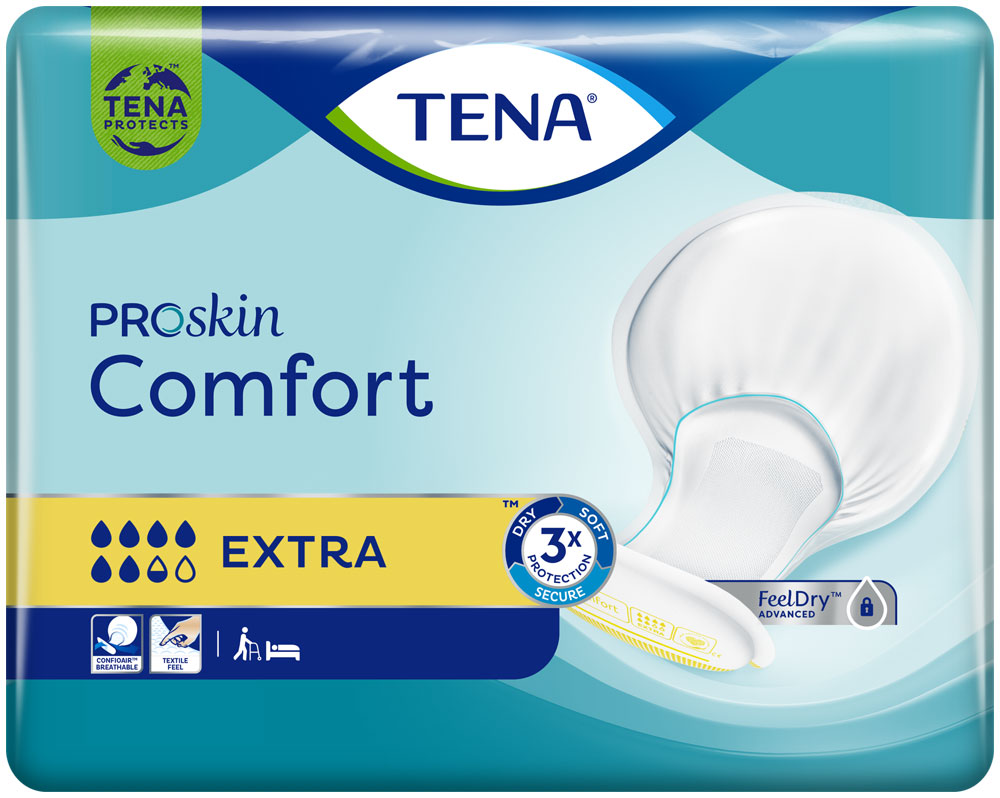 Die TENA Comfort Extra mit ConfioAir™ nutzt atmungsaktive Materialien, die es der Haut ermöglichen zu atmen und die Hautgesundheit aufrecht zu erhalten sowie Hautirritationen zu verhindern. Die neue vollständig atmungsaktive und textilartige Rückseite bewahrt die Trockenheit für mehr Komfort und gesunde Haut und fühlt sich weicher und komfortabler an. Die einzigartige Schalenform bietet Auslaufschutz und körpernahen Sitz.