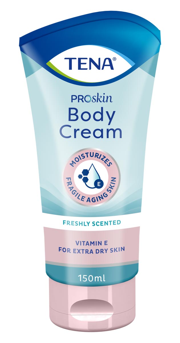 TENA Skin Cream mit ihren milden Inhaltsstoffen ist ideal für trockene Hautpartien oder den ganzen Körper – für die tägliche Hautpflege, speziell nach dem Duschen oder Baden.