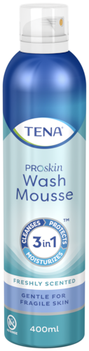 TENA ProSkin Wash Mousse ist eine sanfte Alternative zu Wasser und Seife und ideal für die häufige Reinigung, insbesondere bei der Inkontinenzversorgung. Der frisch duftende 3-in-1-Schaum reinigt, schützt und befeuchtet die angegriffene, alternde Haut. Einfach und bequem – sprühen Sie vor dem Reinigen der Haut ein wenig Schaum auf einen Waschlappen. Es ist kein Nachspülen notwendig. Das TENA ProSkin Wash Mousse hilft, den natürlichen pH-Wert der Haut zu erhalten und fördert damit die Hautgesundheit.